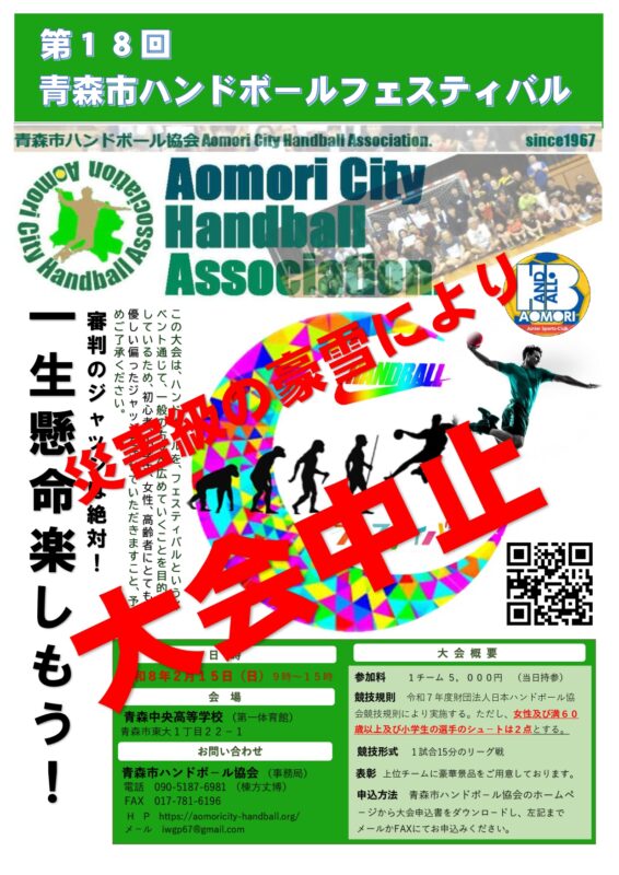 さて、青森市ハンドボ-ル協会では2月15日に開催を予定しておりました「第18回青森市ハンドボールフェスティバル」について、諸般の事情と皆さまの安全を最優先に考慮し、誠に残念ながら中止させていただくことといたしました。