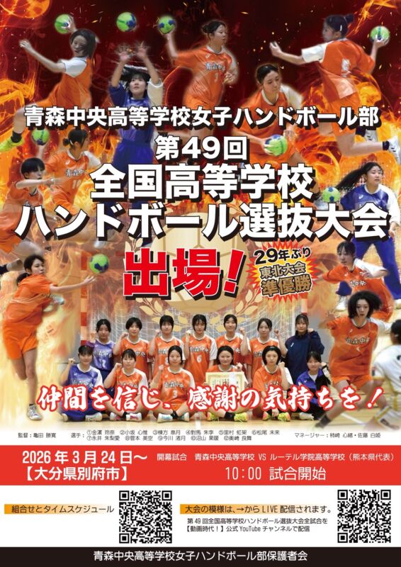 さて、この度は「青森中央高等学校女子ハンドボ-ル部の第49回全国高等学校ハンドボール選抜大会」出場に際し、温かいご支援を賜りまして、誠にありがとうございました。